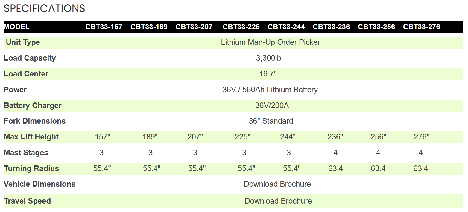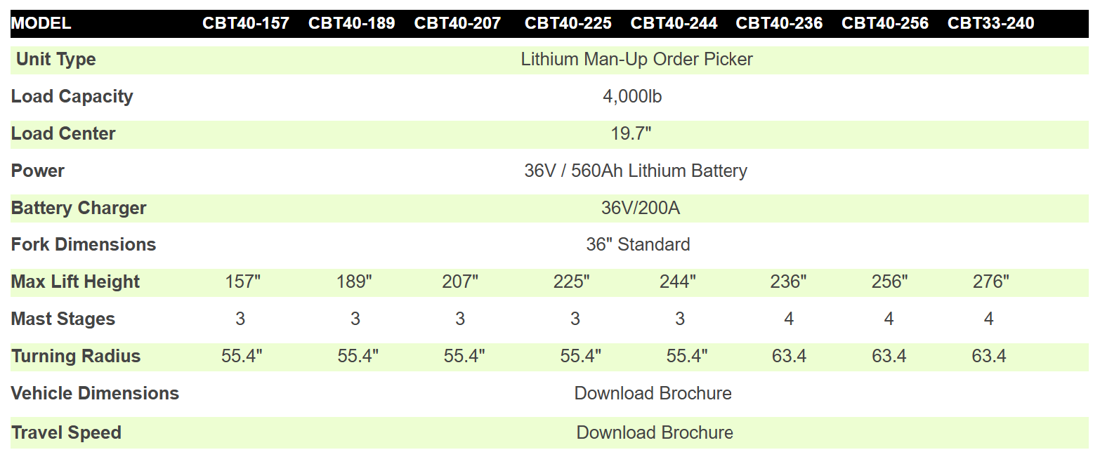 The CBT33-40 Series 3,300 to 4,000lbs capacity Lithium Stand-Up Counterbalance Forklifts are designed for indoor applications where the operator needs to get on and off the vehicle frequently. Engineered for reliability and performance, these forklifts offer exceptional visibility, ensuring precision and safety in a variety of applications from loading trailers to navigating through busy warehouse aisles.
